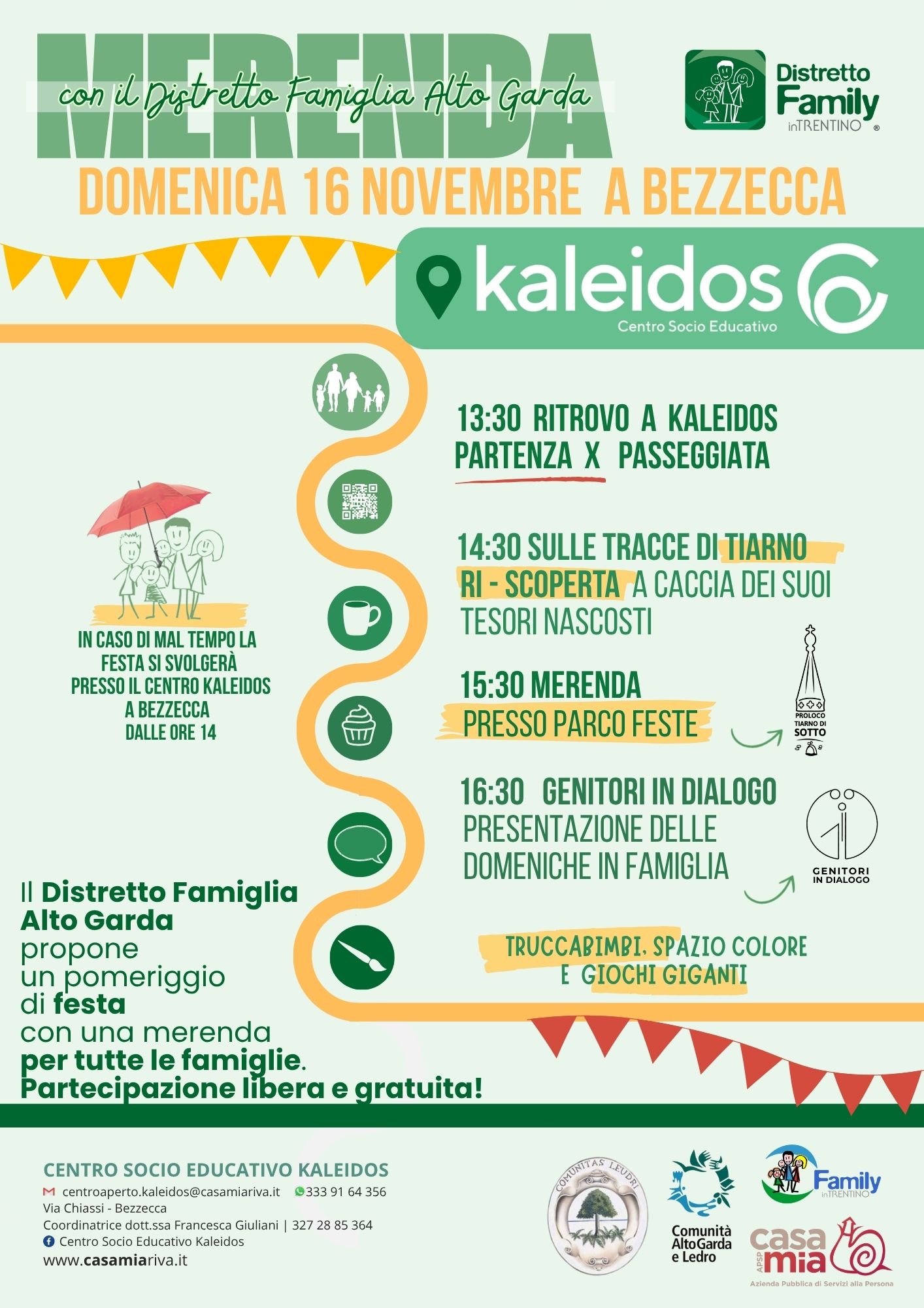 L’iniziativa, con la collaborazione di APSP Casa Mia, Gruppo Genitori in Dialogo e la Pro Loco di Tiarno di Sotto, prevede una passeggiata per famiglie con partenza alle ore 13.30 dal Centro Kaleidos di Bezzecca (Via Chiassi) fino a Tiarno di Sotto, a seguire: giochi, truccabimbi e una merenda condivisa presso il Parco Feste Santa Lucia in un clima accogliente e informale.