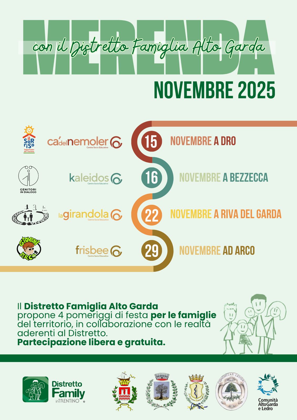 MerendaFamily - domenica 16 novembre 2025, un pomeriggio di festa dedicato alle famiglie, organizzato nell’ambito delle attività del Distretto Famiglia Alto Garda (locandina in allegato).